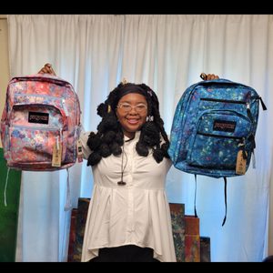 Header image: Fine Arts student MJ Cooper shows off JanSport bags featuring reproductions of her acrylic paintings.
